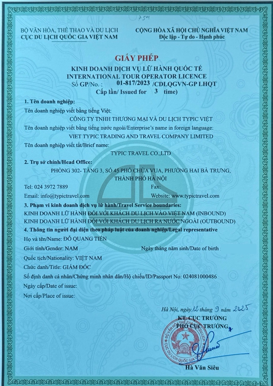 - A professional and special license (International Tour Operator), issued by the General Administration of Tourism of Vietnam, directly under the Ministry of Culture, Sports and Tourism: Typic Travel International Tour Operator License No: 01-817 /TCDL-GPLHQT (VNAT)