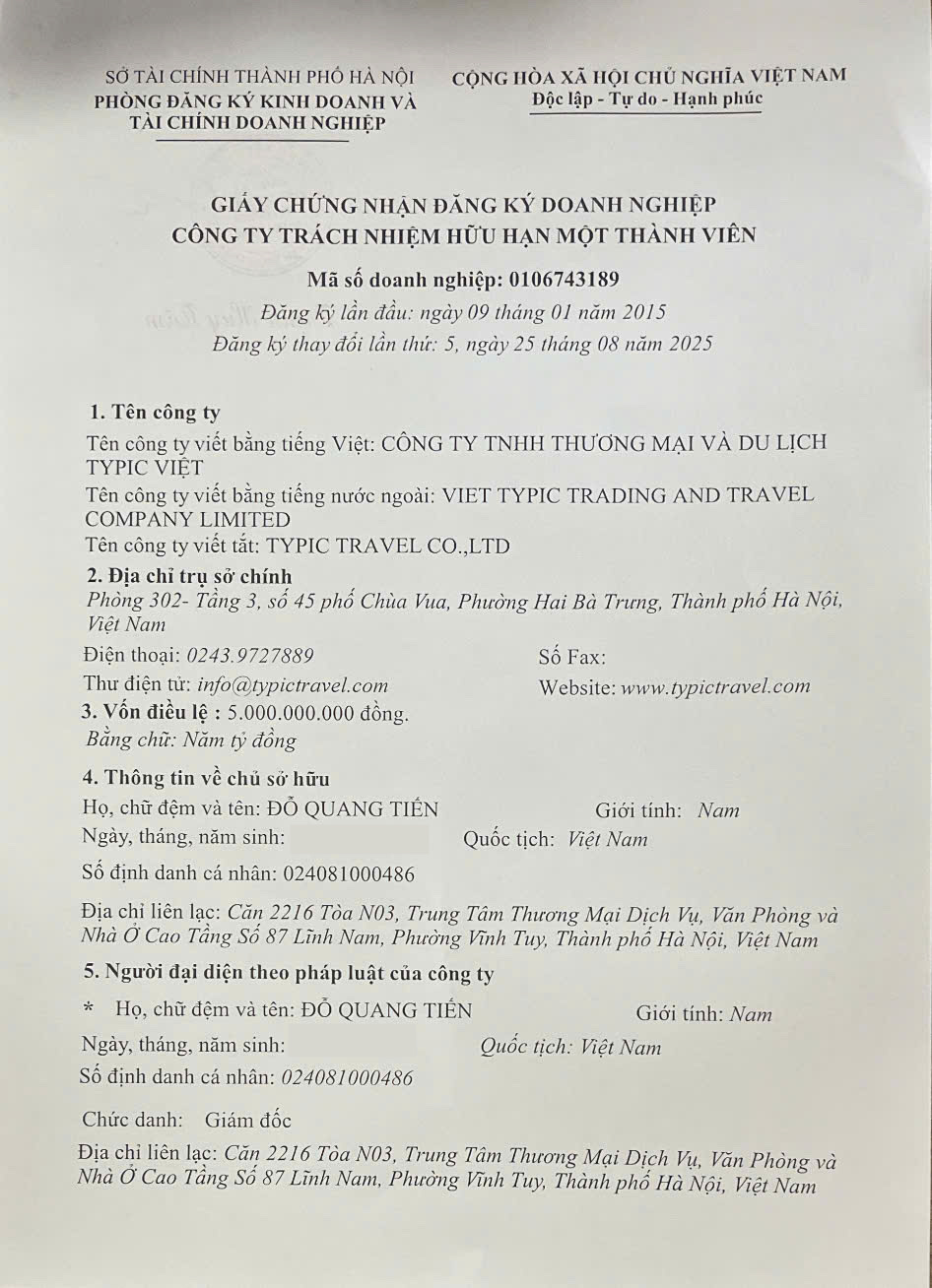 Or with the trade name TYPIC TRAVEL CO. LTD, which holds a business license at registered number: 0106743189 issued by the Ministry of Planning and Investment as in these photos below.