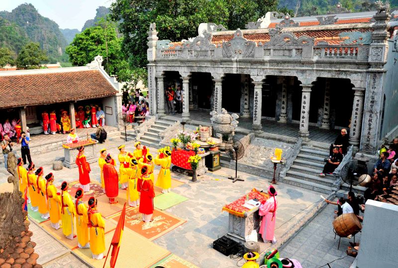 The lower pavilion, made entirely of stone, is accessible via a picturesque bridge over a lotus lake. The middle pavilion, built into the rock, impresses with its unique architecture and sculptures depicting the four sacred animals of Buddhism. Finally, the upper pavilion, perched at the top of the mountain, offers a breathtaking panoramic view of the Ninh Binh landscapes.