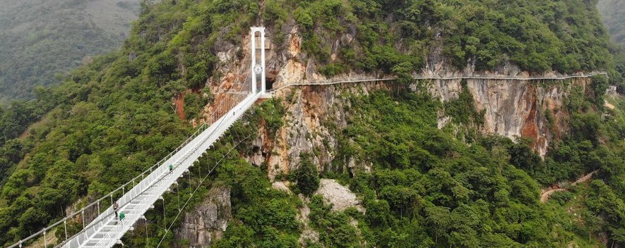 Located in Môc Châu in the province of Son La (northwestern Vietnam), a place that you can visit thanks to our North Vietnam otherwise tour, Bach Long bridge winds along a rock wall before ending in a suspended footbridge that straddles a huge valley. This vertiginous architectural work is largely transparent, so those who venture there have the impression of walking in a vacuum.
